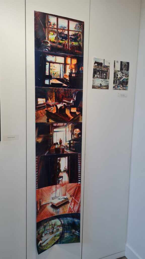 Ce dessin juxtapose 3 scènes d’un film parlant de la fin du monde. Cet exercice modifie le sens de la narration et crée une nouvelle romance.